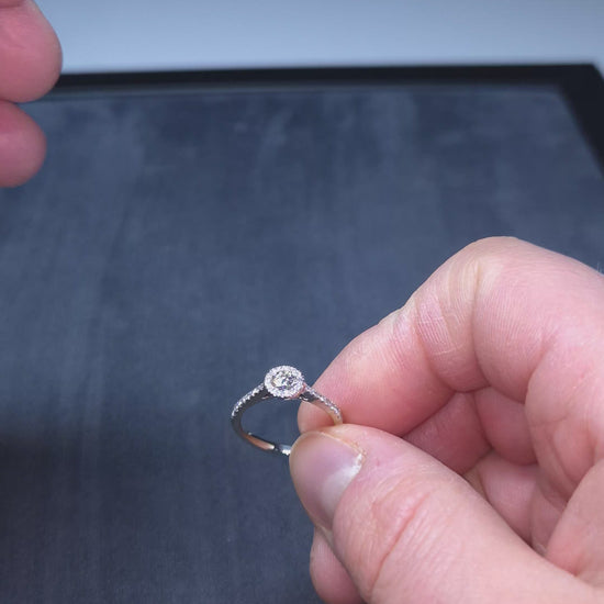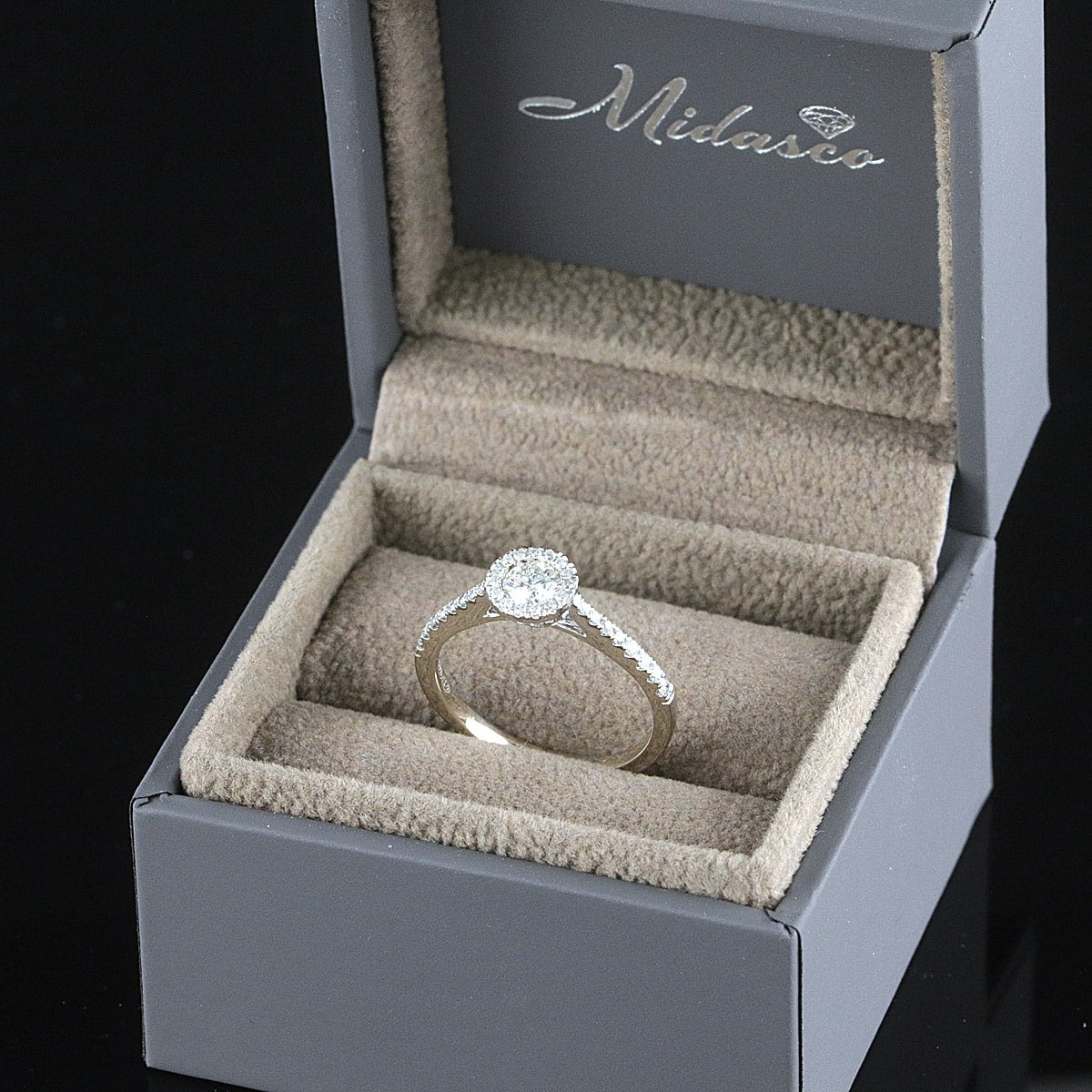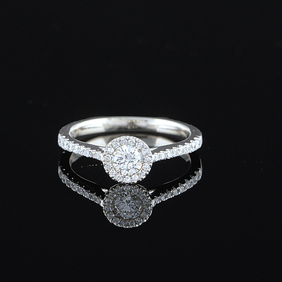 Halo-muotoilu on yksi korumaailman älykkäimmistä ratkaisuista: keskikiveä ympäröivät pienemmät timantit moninkertaistavat sormuksen säteilyn ja saavat keskikiven näyttämään suuremmalta kuin se on. Tässä sormuksessa 0,40 ct timantit on asetettu klassiseen halo-kehykseen — tulos on sormus, joka vie katseen ja pitää sen.